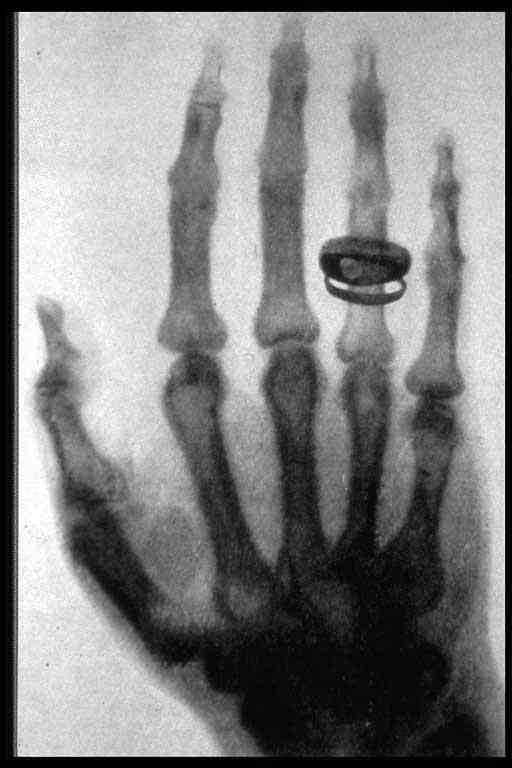 Em 1895, Wilhelm Conrad Röntgen, trabalhava em seu laboratório na observação da condução da eletricidade de um tubo catódico quando percebeu um brilho fluorescente de cristais em uma mesa próxima do tubo. Röntgen envolveu o tubo com papel pesado e negro, descobrindo uma luz verde fluorescente gerada por um material. Concluiu que uma radiação estava sendo emitida pelo tubo, sendo capaz de atravessar a proteção de papel pesado e excitando os materiais fluorescentes na sala. O alemão descobriu que essa radiação conseguia atravessar a maior parte das substancias e projetar sombras de objetos sólidos, além de que a radiação conseguia atravessar tecidos humanos, mas não ossos e objetos metálicos. Uma de suas experiências foi colocar a mão na frente do tubo e observar as sombras projetadas na tela, tal raio foi denominado “raios-X”.